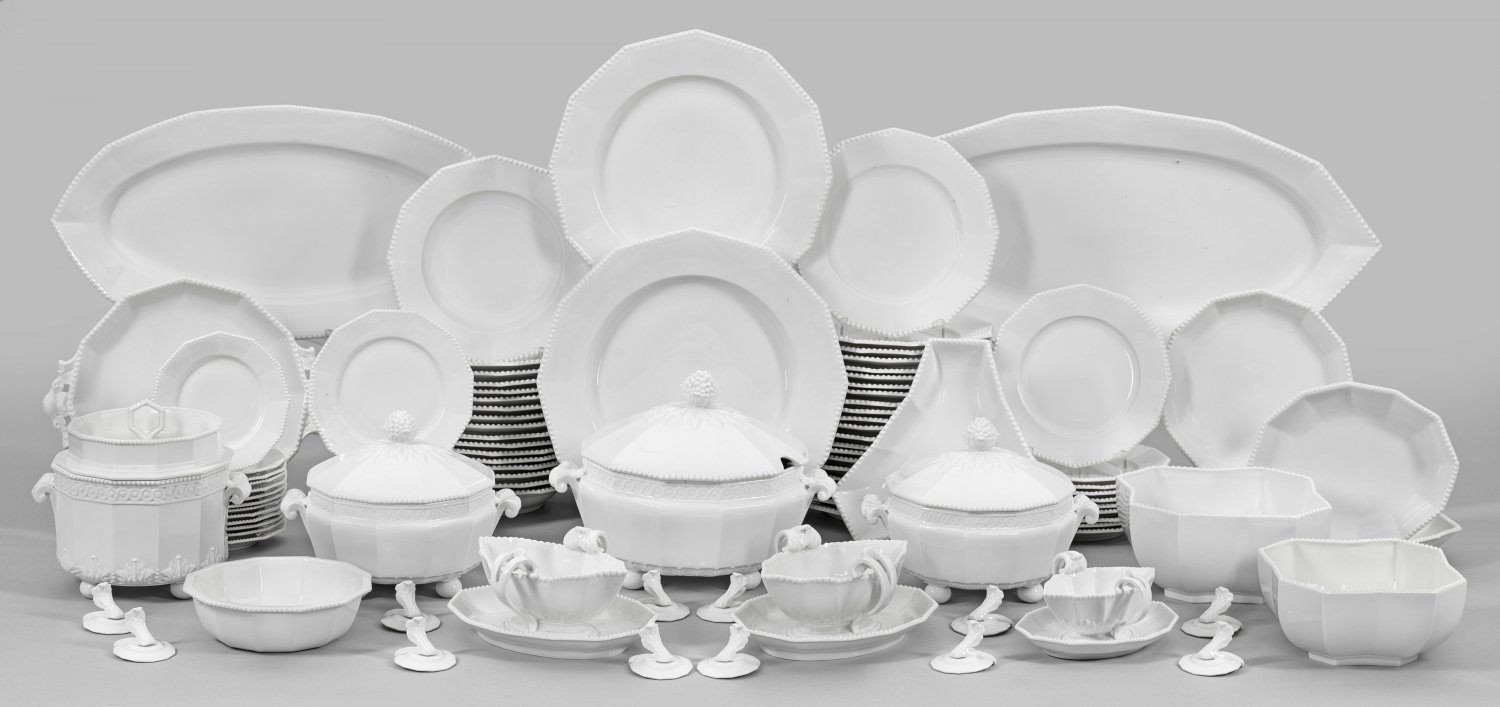 Umfangreiches Speiseservice "Perl" mit Reliefdekor Weißporzellan. 96-tlg.; 22 Speise-, 10 Vorspeise-, 17 Suppen-, 4 Dessert-, 13 Brotteller, 2 Anbietplatten, 2 -teller, 3 Deckelterrinen, 3 Saucieren, 7 Beilagenschalen, Eiskühler, 12 Menükartenhalter. Modell "Perl" mit umlaufendem, reliefiertem Perlfries, Flechtbandbordüre sowie Akanthusblattreliefs und plastischen Fruchtknäufen. Teilw. best.; Teilw. Brandflecke. Manufakturmarke. Plattenmaße 56 cm - 65 cm. Terrinen-H. 19 cm - 23 cm. Teller-D. 15 cm - 34 cm.