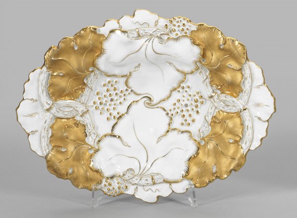 Prunkschale mit Reliefdekor Ovale gemuldete Form. Flächendeckender reliefierter Weinrebendekor mit großen Weinblättern in Glanz- und Mattgold (sog. Goldbronze). Schwertermarke. 36 cm x 27 cm.
