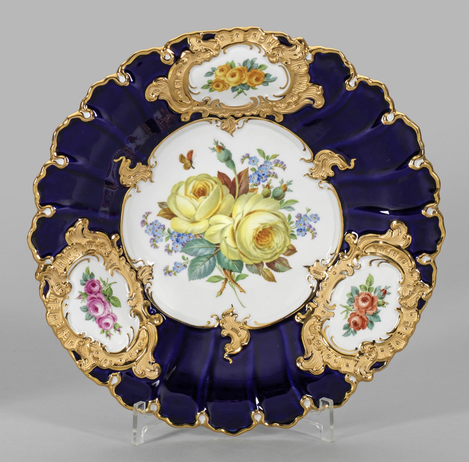 Prunkschale mit Rosendekor aus limitierter Auflage Runde, gemuldete Form. Kobaltblauer Fond mit ausgesparten Rocaillereserven im Relief. Darin farbenfrohe Blumenmalerei. Reiche Staffage in Glanz- und Mattgold (sog. Goldbronze). Limitierte Aufl. 2/50. Schwertermarke mit Bez. "Meissen". D. 31 cm.