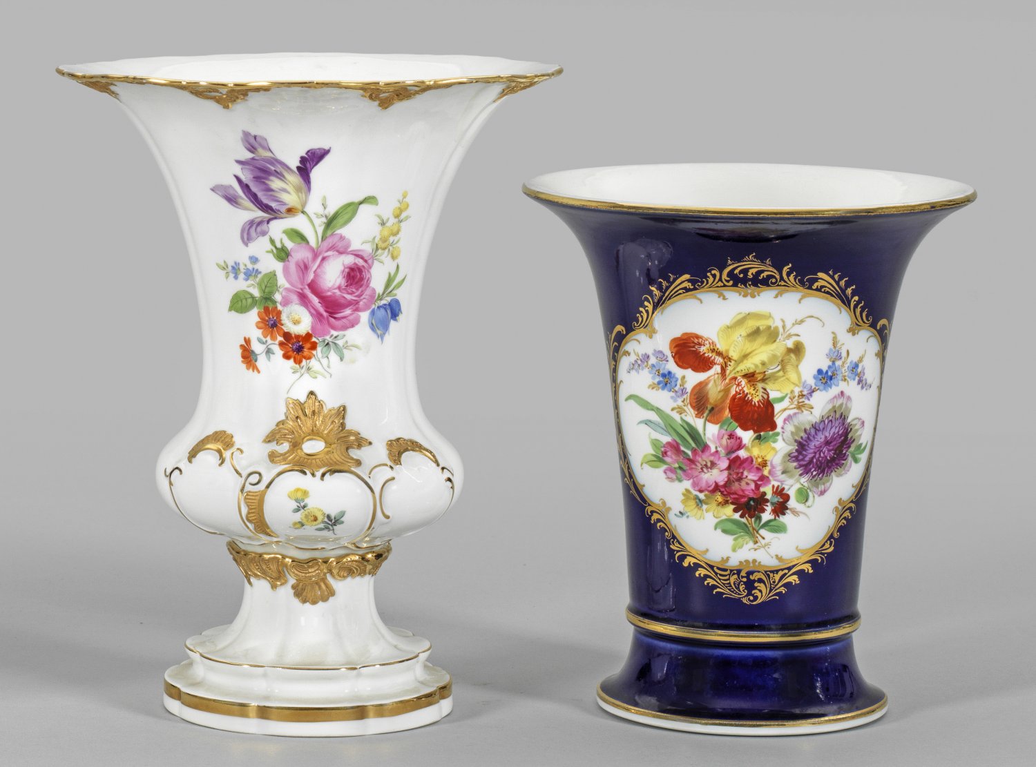 Zwei prächtige Ziervasen mit Blumendekor Trompetenform. Auf der Wandung farbenprächtige Blumenmalerei umzogen von Golddekor. Teilw. kobaltblauer Fond. Schwertermarke. H. 19 cm - 24 cm.