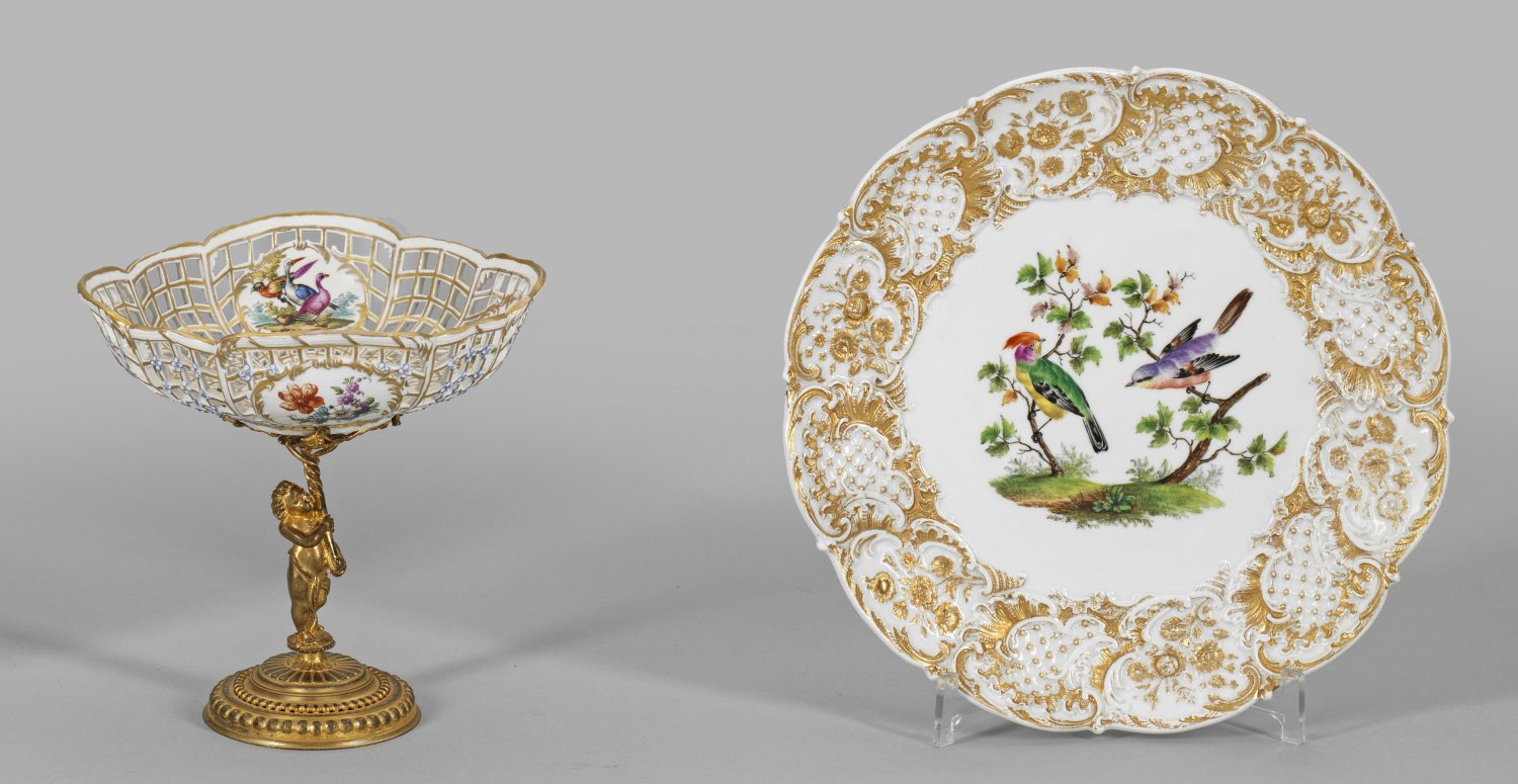 Aufsatzschale und Prunkteller mit Vogeldekor teilw. mit vergoldetem Bronzefuß in Gestalt eines Puttos. Geschweifte, teilw. durchbrochen gearbeitete Form. Umlaufend Reliefdekor aus Rocaillekartuschen. Auf den Wandungen und im Spiegel farbenprächtiger Vogel- und Blumendekor in polychromer Malerei. Reiche Goldstaffage. Unw. ber.; Schwerter- und Zeptermarke. H. 20 cm. D. 19 cm - 29 cm.