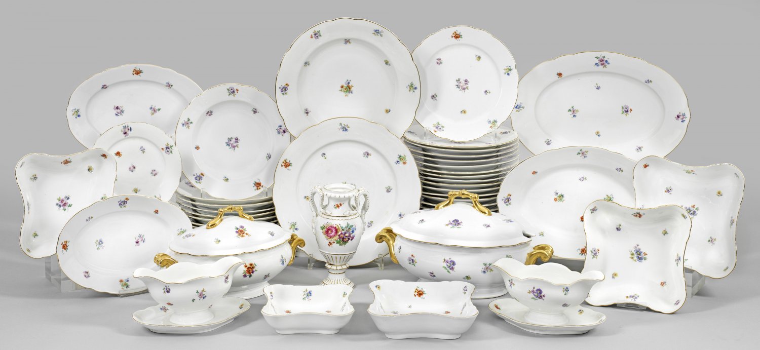Speiseservice mit Streublumendekor für 12 Personen. 65-tlg.; 12 Suppen-, 24 Speise-, 12 Kuchenteller, 2 Deckelterrinen, 2 Saucieren, 11 Beilagenschalen und eine -platte sowie 1 Vase. Farbiger Streublumendekor in polychromer Malerei. Goldrand. Minim. besch./best./ber.; Manufakturmarke. Terrinen 30 cm - 34 cm x 18 cm x 28 cm.