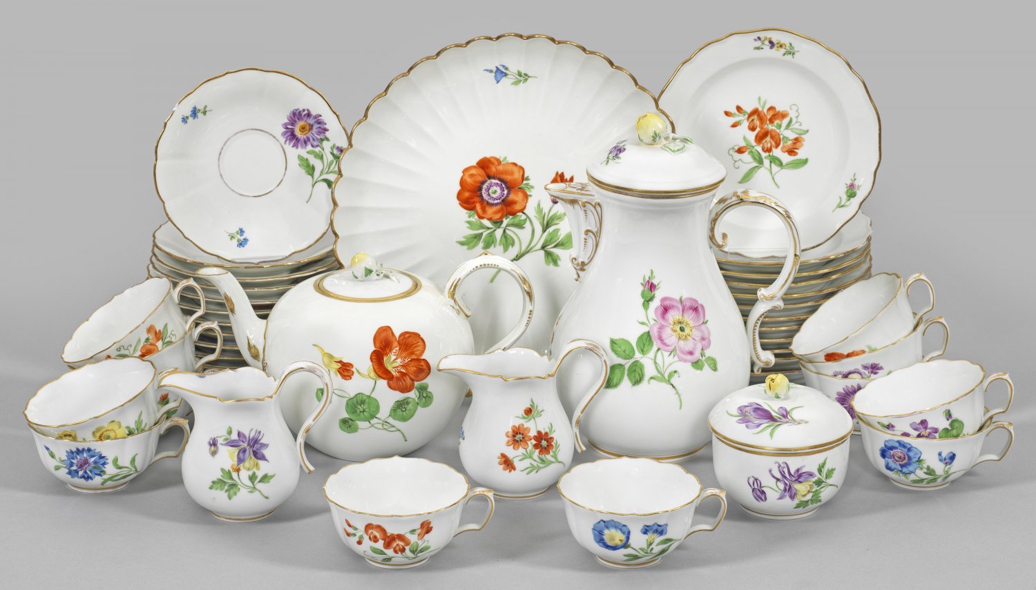 Kaffee- und Teeservice mit Dekor "Deutsche Blume" für 12 Personen. 30-tlg.; Kaffee-, Teekanne, 2 Sahnegießer, Zuckerdose, 12 Tassen mit Untertassen, 12 Kuchenteller, Kuchenplatte. Auf der Wandung und im Spiegel farbenprächtiger Blumendekor in polychromer Malerei. Goldstaffage. Teilw. minim. besch./ber.; Schwertermarke. Kannen-H. 23 cm. Platten-D. 27 cm.