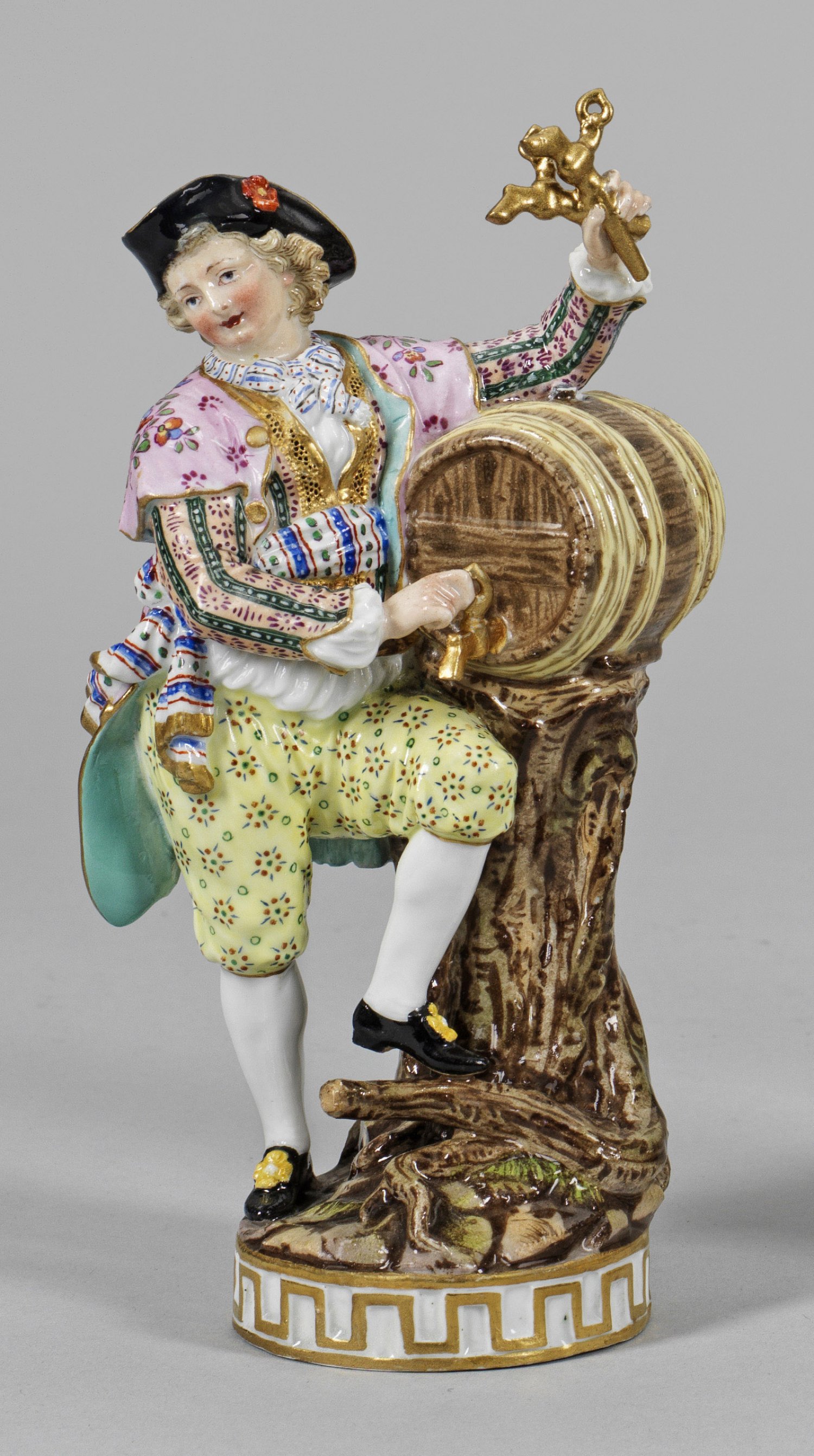 Junger Winzer Runder Sockel mit Ornamentbordüre. An einem Baumstumpf stehender junger Herr, sich auf ein Weinfass stützend. In der linken Hand einen Zapfhahn emporhaltend. Polychrome Malerei mit Goldstaffage. Entw. Michel Victor Acier. Modell-Nr. F 80. Best.; Unw. rest.; Schwertermarke. H. 18 cm.