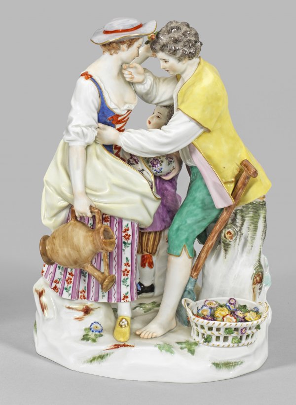 Gärtnergruppe Auf felsigem, mit plastischen Blüten belegtem Sockel komponiertes Gärtnerpaar mit Gießkanne, Spaten und gefülltem Blumenkorb. Rückseitig stehender Gärtnerknabe. Polychrome Malerei mit Goldkonturierung. Entw. Michel Victor Acier. Modell-Nr. B 11. Minim. best.; Schwertermarke. H. 26 cm.