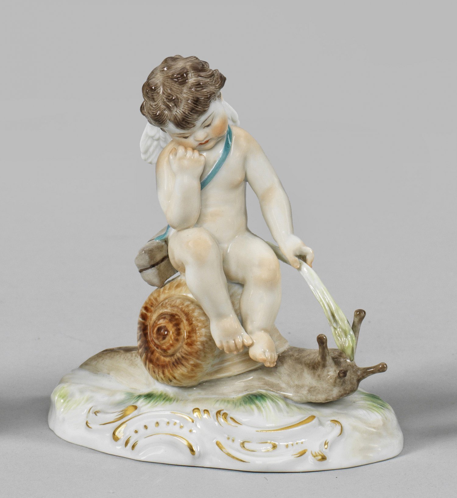"Schneckenpost". Originaltitel aus der limitierten Edition "Sinn Bilder" von 2004. Auf einer Schnecke reitender, schlummernder Putto, auf dem Rücken ein Päckchen tragend. Polychrome Malerei mit Goldstaffage. Modell 73526. Limitierte Aufl. Nr. 01/50. Schwertermarke mit Sondersignet. H. 10 cm.