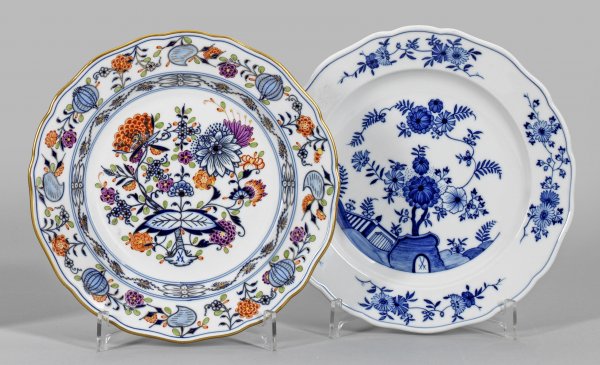 Zwei Zierteller Runde, leicht vertiefte Form. Zwiebelmuster- und sog. Fels- und Vogeldekor in unterglasurblauer Malerei, teilw. mit polychromer Überdekoration in Aufglasur. Teilw. Goldrand. Schwertermarke. D. 25 cm.