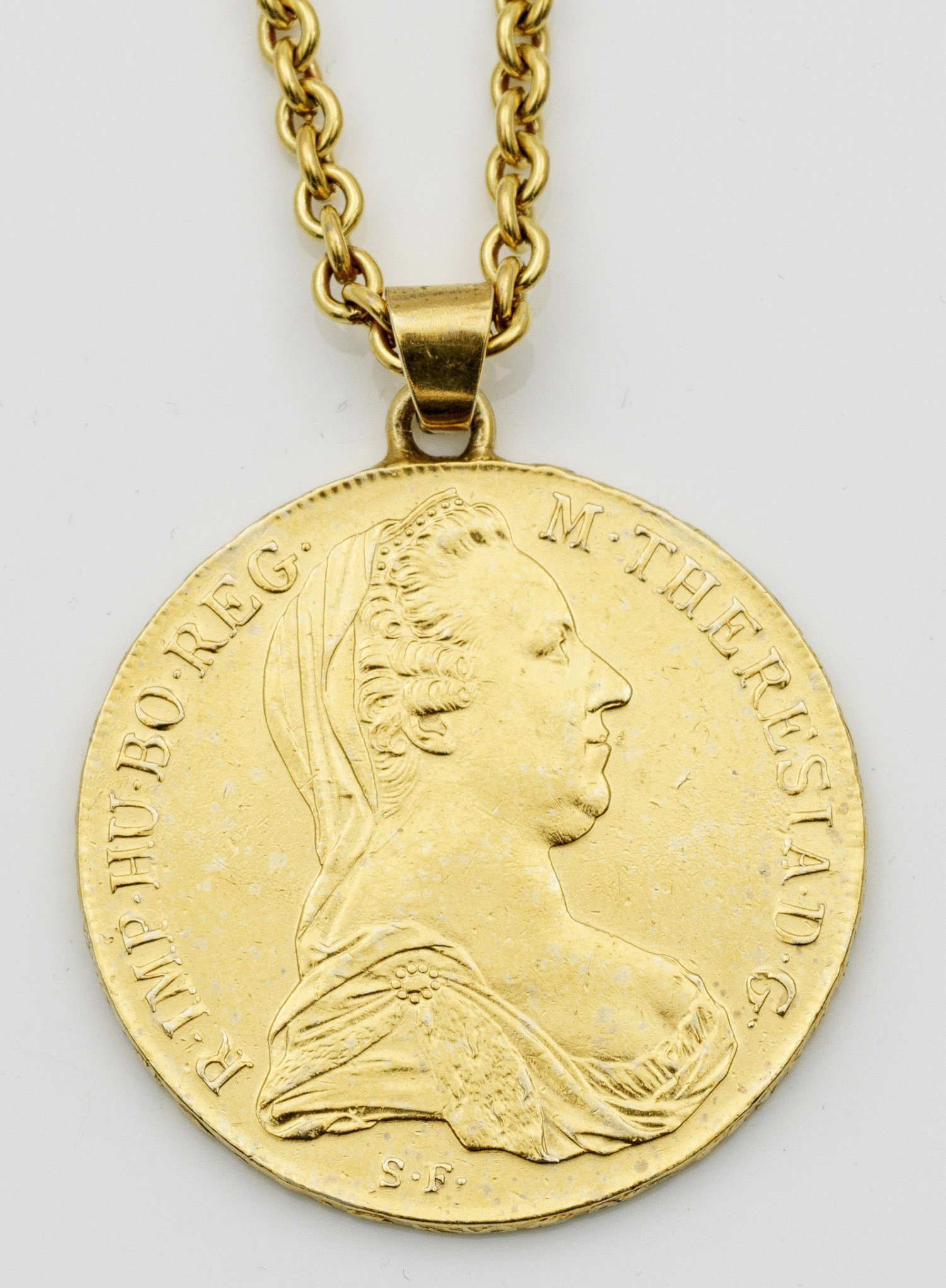 Gedenkmedaille an Kaiserin Maria Theresia von Österreich Vergoldete Medaille mit Reliefdarstellungen Marie Theresia von Österreich-Porträt im Profil sowie gekrönter Doppeladler. Dazu sog. Erbsenkette Gelbgold doubliert.