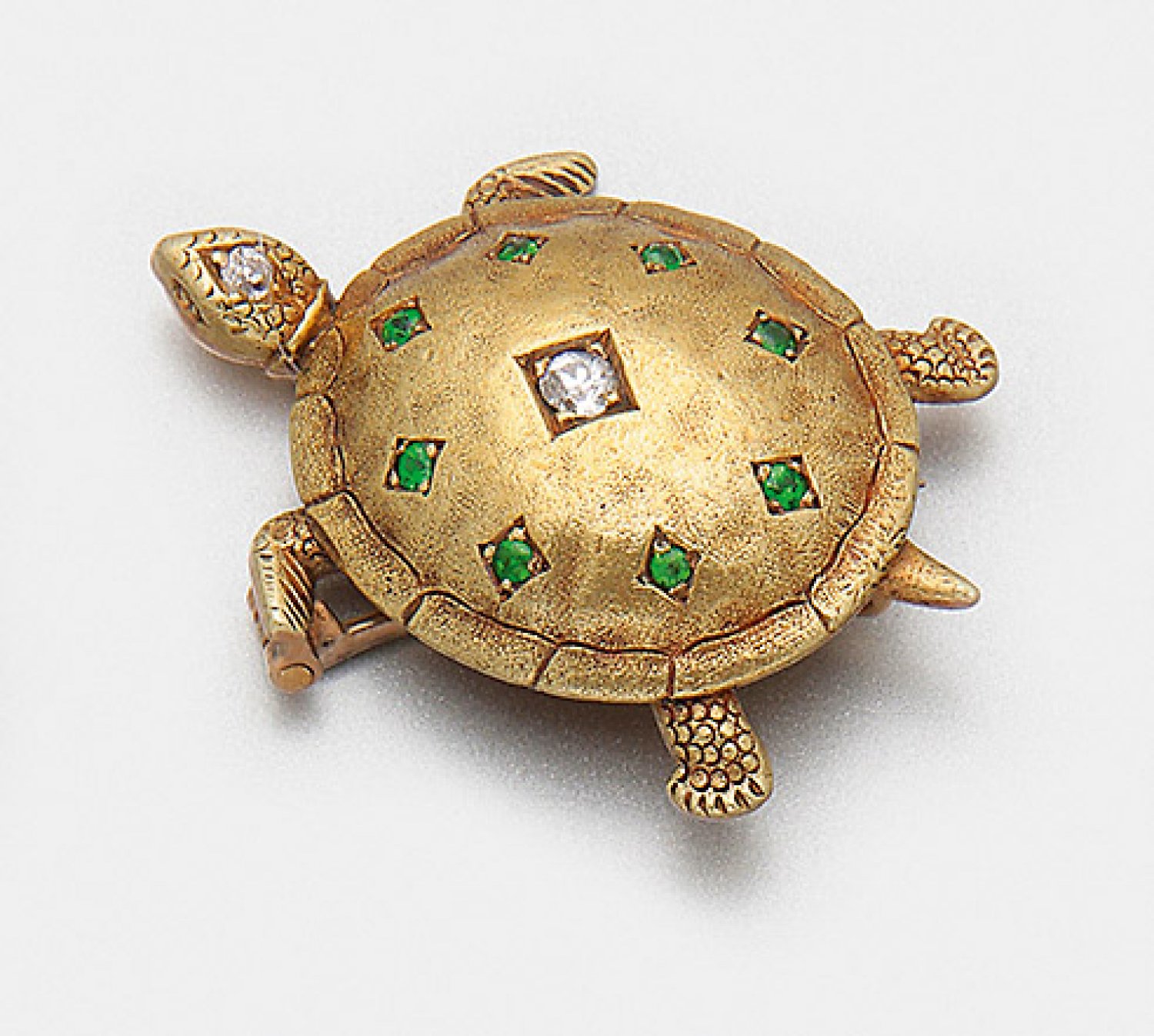 Viktorianische Turtle-Brosche England, um 1880. Gelbgold, 14 ct.; Detailreiche Darstellung einer Schildkröte, akzentuiert durch leuchtendgrüne Granate und zwei kleinen Diamanten. Gew. ca. 7,46 g.