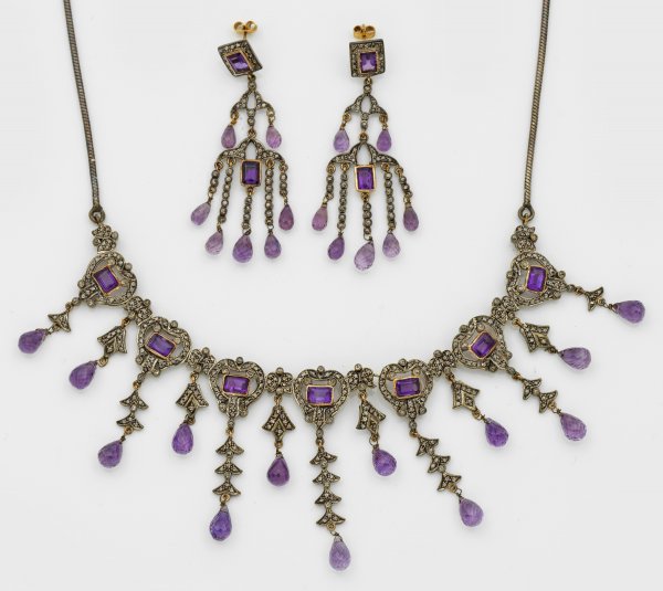 Belle Epoque Amethyst-Demi Parure Silber teilw. vergoldet. Collier und korrespondierendes Paar Chandeliers. Besetzt mit fliederfarbenen Amethysten im Briolettschliff und ausgefasst mit kleinen Diamantrosen. Ges.-Gew. ca. 59 30 g.
