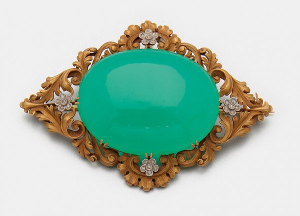 Pompöse Belle Epoque-Brosche mit Chrysopras Gelbgold gest. 750. Vierpassige Kartusche aus Rocaillen und Blattwerk in Ajour besetzt mit einem mintgrünen Chrysopras im Cabochonschliff von ca. 35 mm x 27 mm. Gew. ca. 32 20 g.