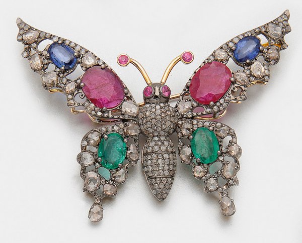Russische Multicolor-Schmetterlings-Brosche Gelbgold, gest. 56 (583), teilw. mit Silber verbödet. Schauseitig besetzt mit Smaragden, Rubinen und Saphiren von zus. ca. 7 ct., akzentuiert durch kleine Diamanten und Diamantrosen von zus. ca. 1,70 ct.; Gew. ca. 15,98 g.