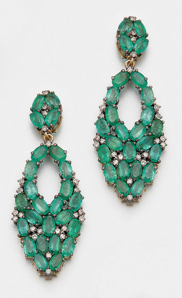 Paar russische Smaragd-Pendeloques Gelbgold, gest. 56 (583), teilw. mit Silber verbödet. Schauseitig besetzt mit leuchtendgrünen Smaragden von zus. ca. 11 ct., akzentuiert durch kleine Diamanten von zus. ca. 0,40 ct.; Ges.-Gew. ca. 11,70 g.