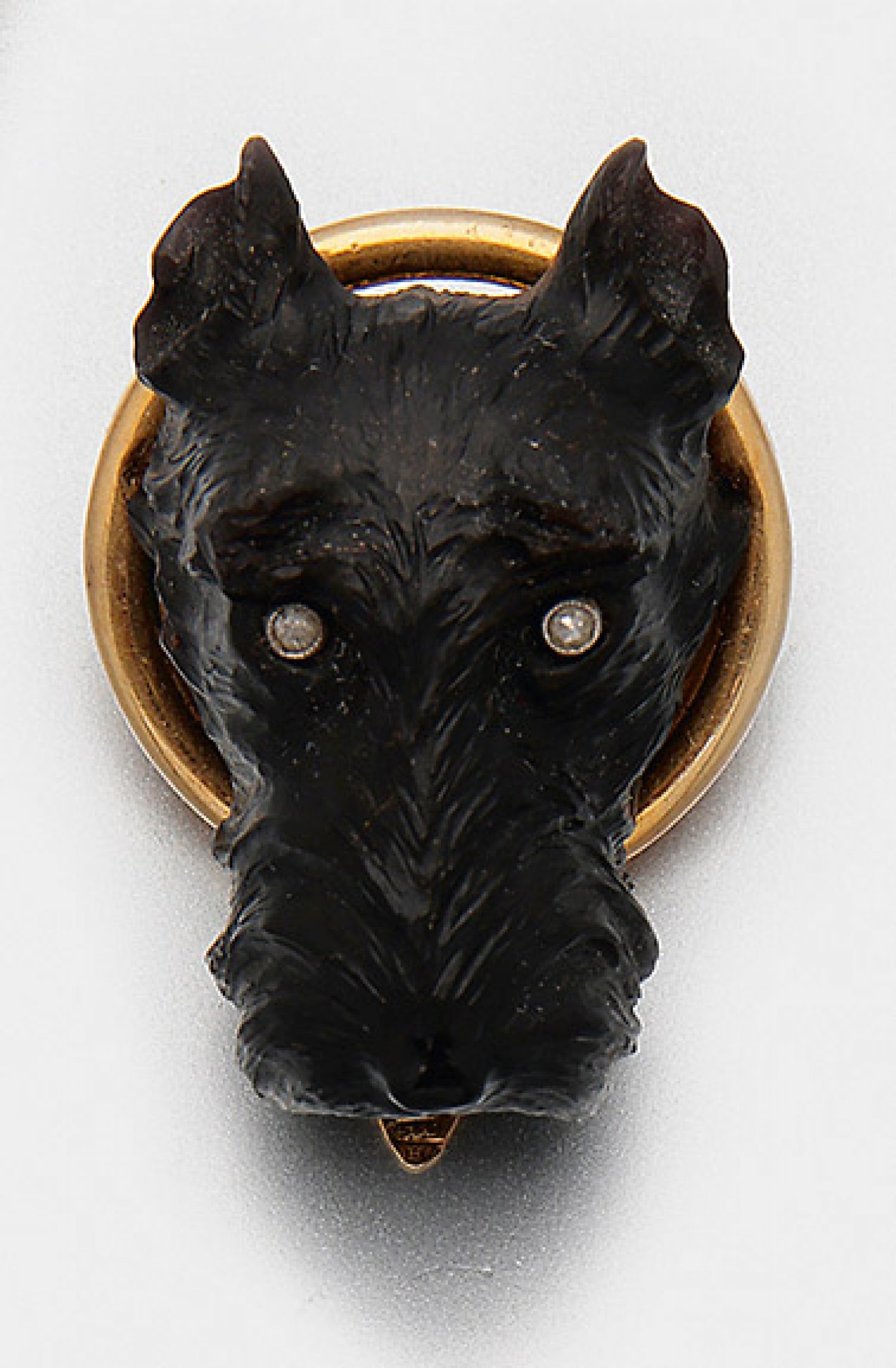 Wien um 1930 Hunde-Clip-Brosche von Rozet & Fischmeister Wien um 1930 Gelbgold gest. 585. Detailreiche Darstellung eines Terrierkopfes aus schwarzem Labrador besetzt mit zwei kleinen Diamanten. Herstellerzeichen. Gew. ca. 18 75 g.