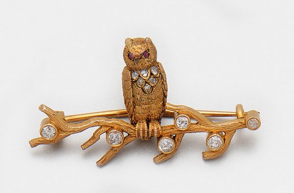 Viktorianische "Uhu"-Brosche mit Diamanten Gelbgold, 14 ct.; Vollplastische Darstellung eines Uhus auf einem Ast sitzend, besetzt mit Diamantrosen von zus. ca. 0,30 ct.; Sehr feine Goldschmiedeausführung. Gew. ca. 10,51 g.