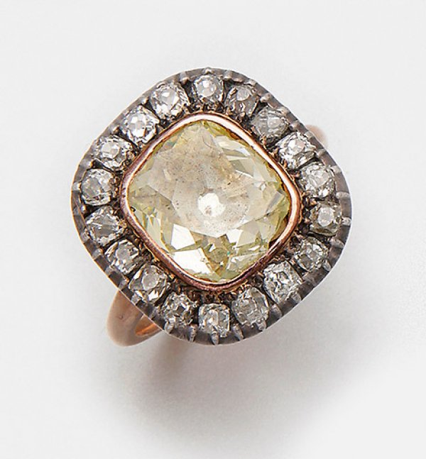 Belle Epoque-Diamantring Gelbgold 14 ct. und Silber. Zentral besetzt mit einem Natural Fancy-Greenish-Altschliffdiamanten von ca. 2 52 ct. (si) entouriert von korrespondierenden Diamanten von zus. ca. 1 40 ct.. Gew. ca. 7 88 g.