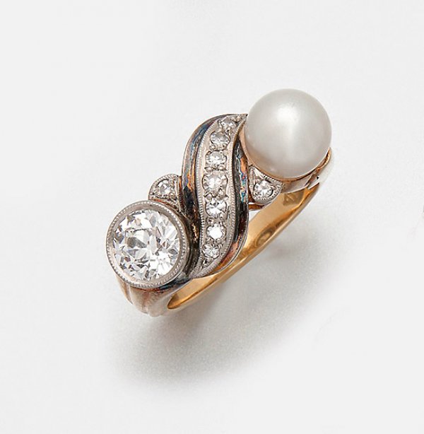 Art Déco-"Toi et Moi"-Diamantring Roségold, gest. 585. Besetzt mit einem Altschliffdiamanten von ca.1,00 ct. und einer weißen Zuchtperle von ca. 7,4 mm, unterteilt durch korrespondierende Diamanten von ca. 0,50 ct.; Gew. ca. 8,18 g.