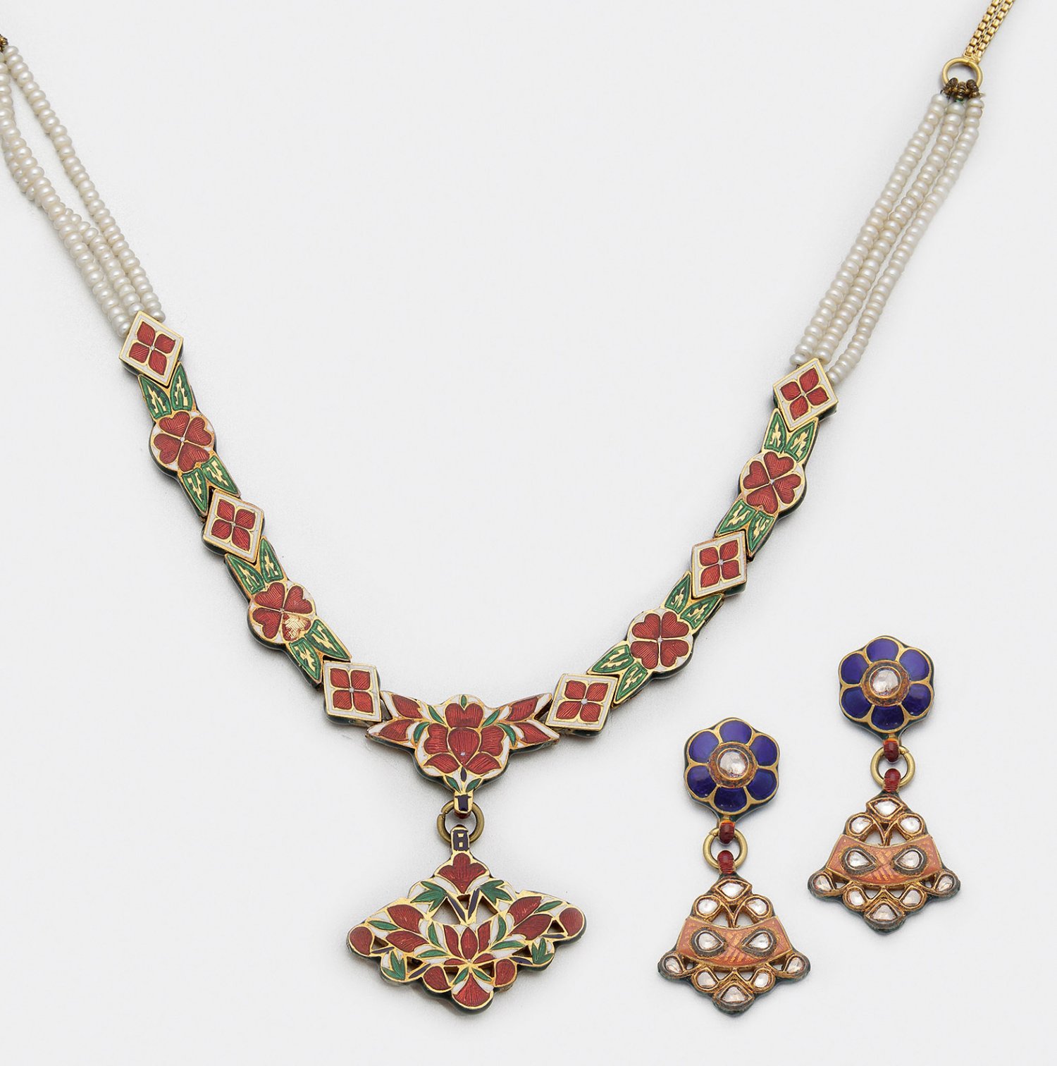 Traditionelles Indisches Hochzeits-Parure Collier und korrespondierendes paar Ohrgehänge. Gold 22 ct. teilw. polychromes transluizides Email und kobaltblauer sowie weißer Emaillack. Schauseitig besetzt mit Diamanten im unregelmäßigen Moguhlschliff von ca. 3 00 ct. umrahmt von floralen sowie geometrischen Gliedern. Rückseitiger Dekor aus Blütenrosetten und Blattwerk übergehende weiße Saatperlenbänder in Goldschließe. Ges.-Gew. ca. 55 69 g.