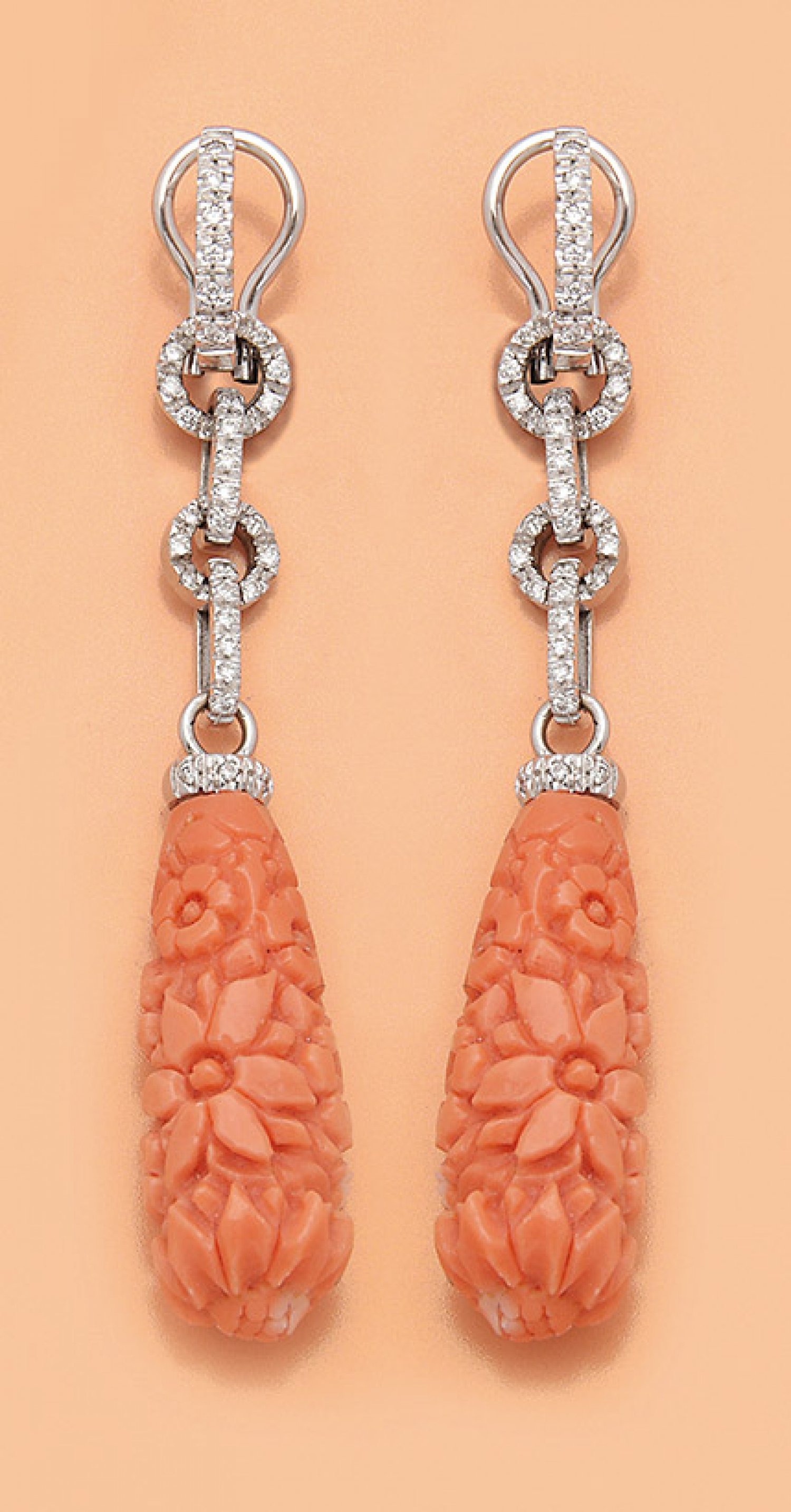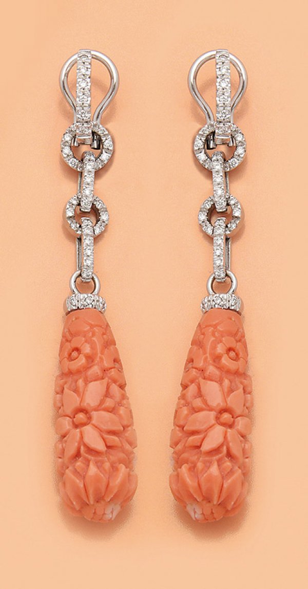 Paar mondäne Pendeloques im Stil der 20er Jahre Weißgold gest. 750. Zentral besetzt mit Brillanten von zus. ca. 0 60 ct. (H/si) und abschließend zwei Engelshaut-Korallen-Pampeln mit floralem Schnitzwerk. Ges.-Gew. ca. 18 22 g.
