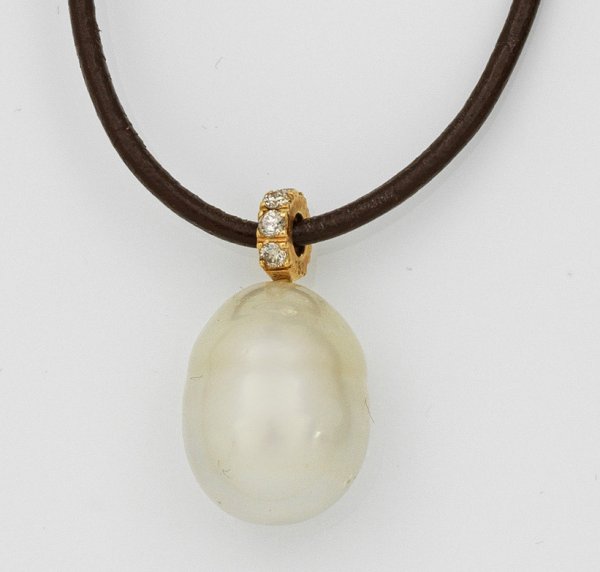 Eleganter Südsee-Perlanhänger Roségold gest. 750. Große weiße Südsee-Zuchtperle in Barockform in sehr feinem rosé-grün changierendem Lüster Öse mit kleinen Brillanten besetzt. Dazu braunes Lederband.