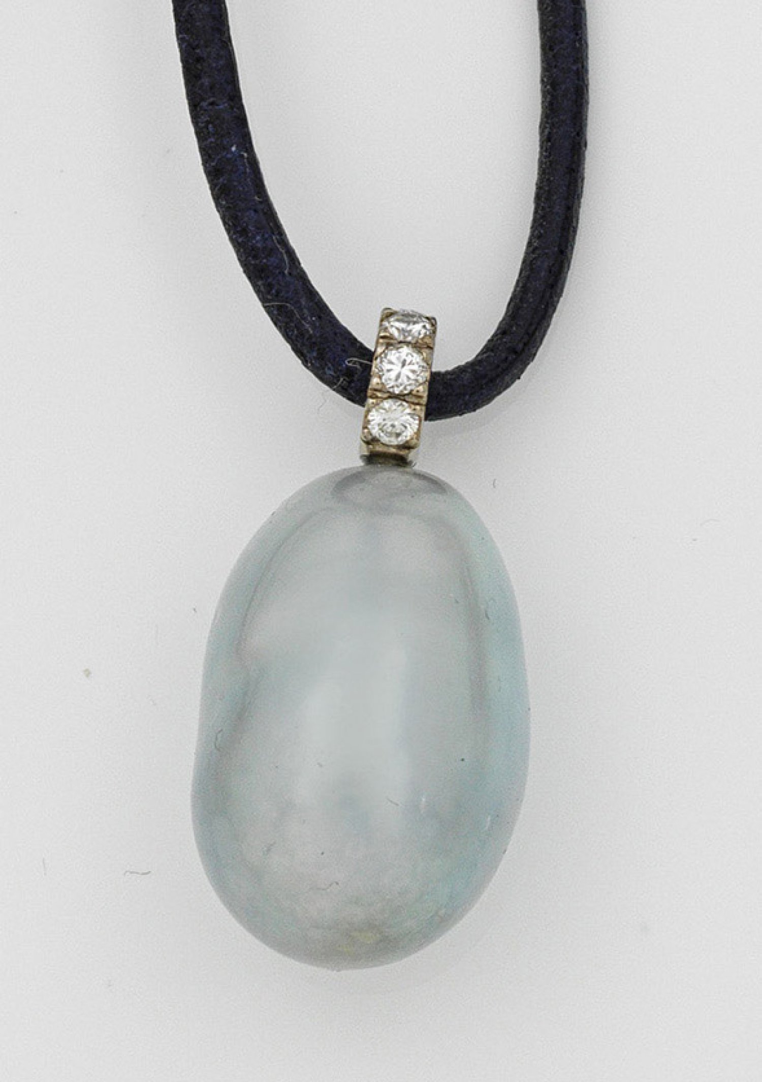 Eleganter Südsee-Perlanhänger Weißgold gest. 750. Große grau-blaue Südsee-Zuchtperle in Barockform in sehr feinem rosé-grün changierendem Lüster Öse mit kleinen Brillanten besetzt. Dazu dunkelblaues Lederband.