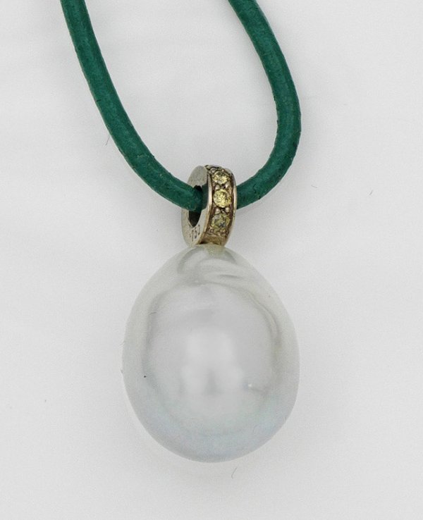 Eleganter Südsee-Perlanhänger Weißgold gest. 750. Große grau-weiße Südsee-Zuchtperle in Barockform in sehr feinem rosé-grün changierendem Lüster Öse mit kleinen Brillanten besetzt. Dazu türkisgrünes Lederband.