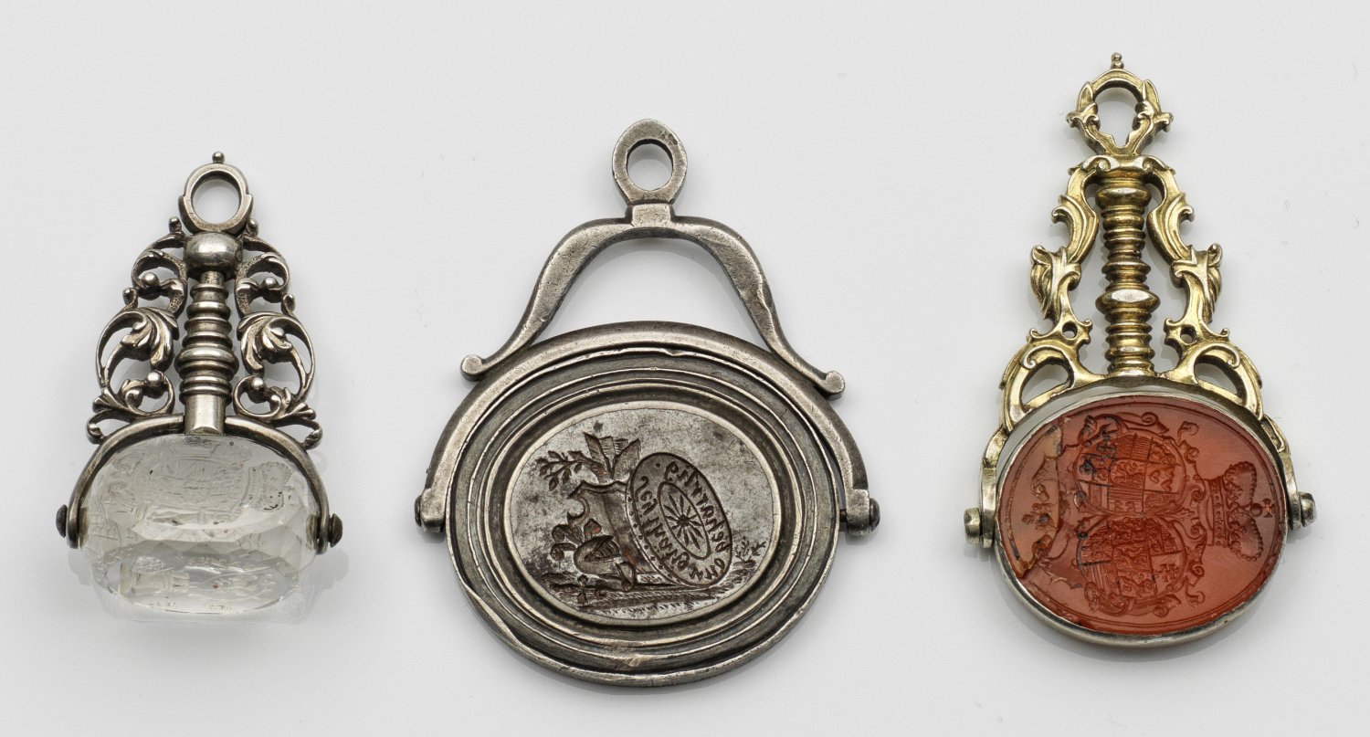 Drei Petschaft-Anhänger Silber, teilw. vergoldet. Geschnittener Karneol und farbloses Glas. Durchbrochen gearbeitete und aus plastischen Voluten geformte Zierbügel mit Ösen. Gravierte Wappen der Fürsten Reuß, der Fürsten von Anhalt sowie das Allianzwappen der Fürsten von Hessen-Darmstadt und der Fürsten zu Solms-Braunfels, anlässlich der Eheschließung 1746 von Friedrich IV. Karl Ludwig Wilhelm von Hessen-Homburg (1724 - 1751) mit Ulrike Luise zu Solms-Braunfels (1731 - 1792). Teilw. besch.; H. 4,3 cm - 5,7 cm.