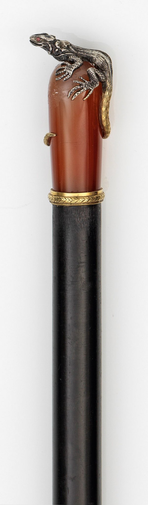 Spazierstock in der Art von Karl Fabergé. Karneol Silber und ebonisiertes Holz. Auf dem konischen Griff eine sich herumschlingende vollplastische Echsenfigur mit vergoldetem Schwanz und Augen aus Farbsteincabochons. Gest. Kokoschnik 88. L. 91 cm.