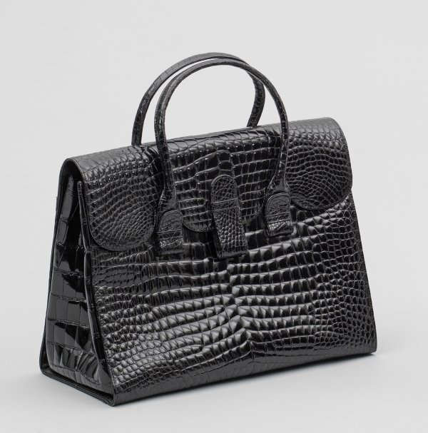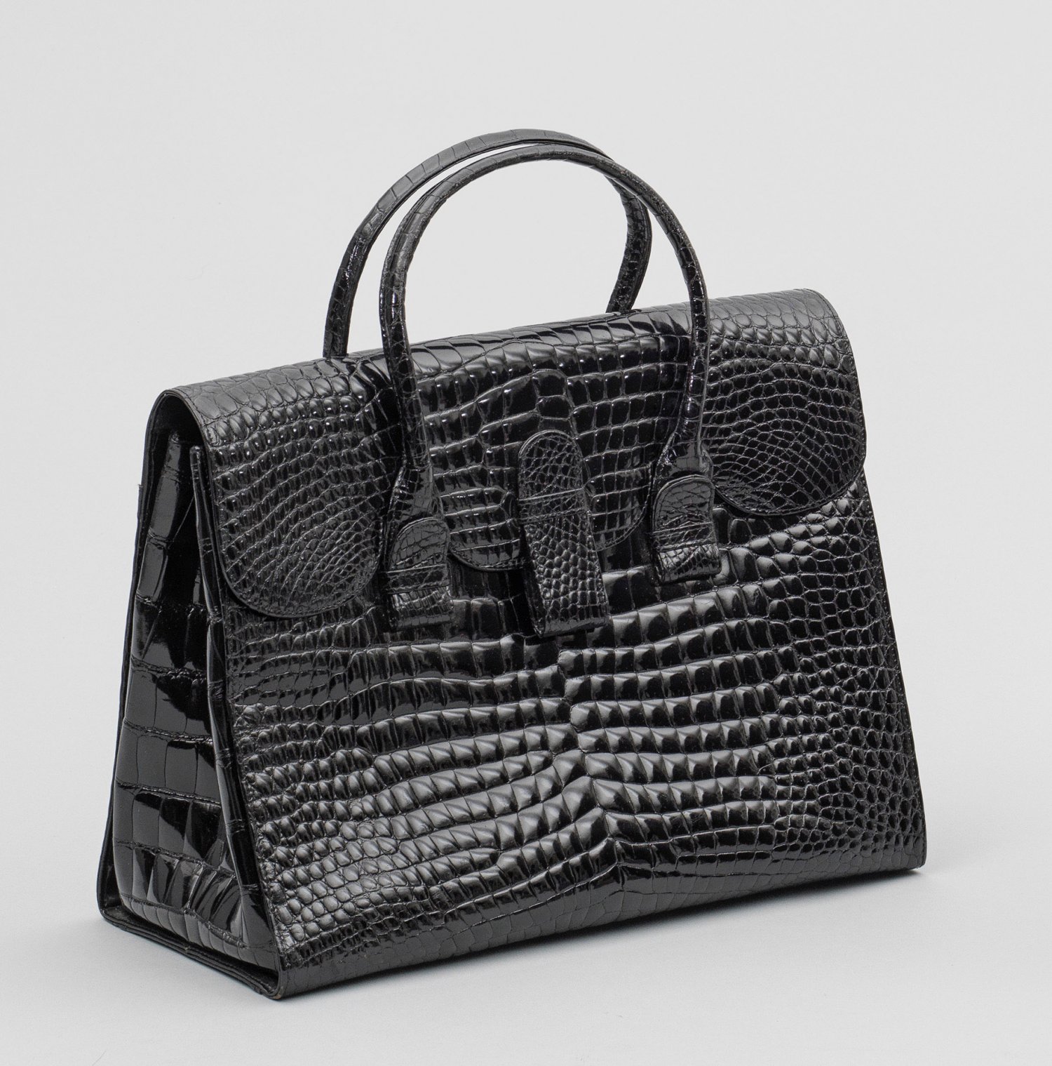 Damen-Handtasche Schwarz glänzendes Krokodilleder. Flacher gekanteter sich konisch verjüngender Korpus mit Rundhenkeln. IRV-Label und Artenschutzfahne. Herstellerzeichen. Made in Germany. Staubbeutel. Ges.-H. 35 cm. 34 5 cm x 16 cm.