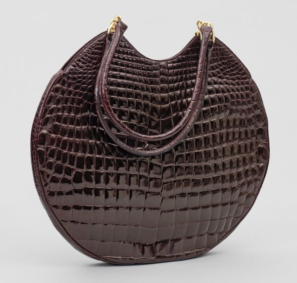 Vintage Damen-Handtasche Auberginefarbenes glänzendes Krokodilleder und vergoldetes Metall. Flacher runder Korpus mit Rundhenkeln. IRV-Label und Artenschutzfahne. Herstellerzeichen. Made in West-Germany. Staubbeutel. Ges.H. 65 cm.