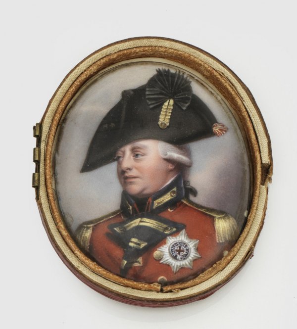 Email auf Kupfer. Ovales Brustbildnis des Königs in roter Generalsuniform mit schwarzem Zweispitz auf dem Kopf, den Stern des Hosenbandordens auf der Brust und mit goldenen Epauletten. Nach einem Gemälde von Sir William Beechey (1753-1839). Rückseitig bez., sign. Henry Pierce Bone (1779-1855) und dat. "July 1801"; Minim. best. Lederbezogene Rahmung, besch.; 6,5 cm x 5,2 cm.
