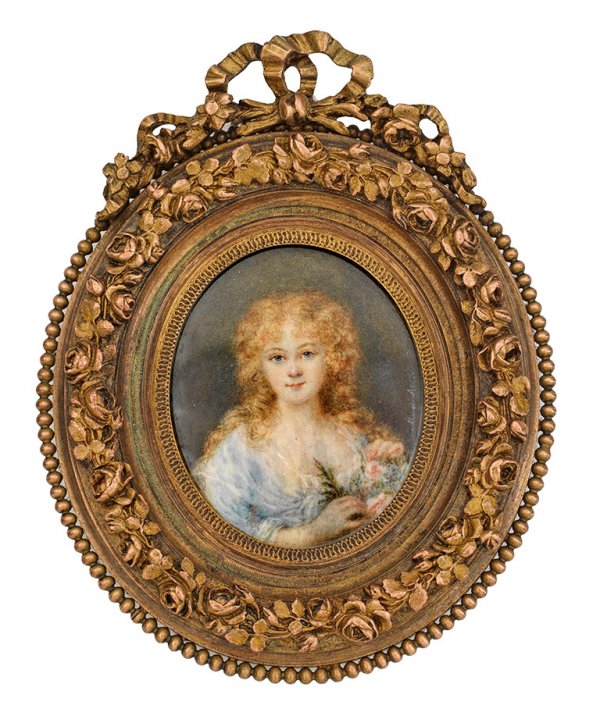 Porträt eines jungen Mädchens Brustbildnis eines jungen Mädchens mit rötlichen lockigen Haaren verträumt an einem Blumenbukett zupfend. Gesicht frontal. Bekleidet mit zart hellblauem Kleid und weißem leicht durchsichtigem Seidentuch über den Schultern. R. m. bez. M. d' Aumont (?). Temperamalerei. Schwerer Bronzerahmen mit Schleife und Rosen verziert. 6 cm x 5 cm.