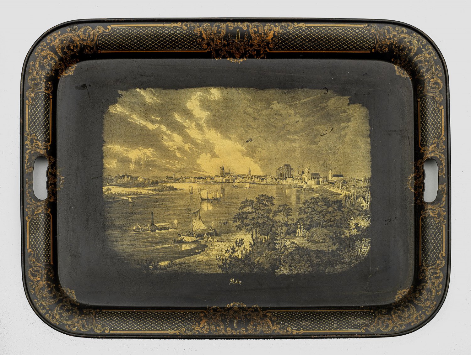 Großes Lacktablett Weißblech, schwarz lackiert. Rechteckig mit ausgesparten Griffmulden. Im Spiegel zentrale Darstellung einer Ansicht Kölns vom Ufer des Rheins aus. Nach einer um 1830 entstandenen Aquatinta von Karl Bodmer (1809 - 1893) "Ansicht von Köln von Norden". Der schräggestellte Rand verziert mit volutiertem Blattranken- und Netzdekor in Gold. Altersgemäße Gebrauchsspuren. 66,5 cm x 60 cm.