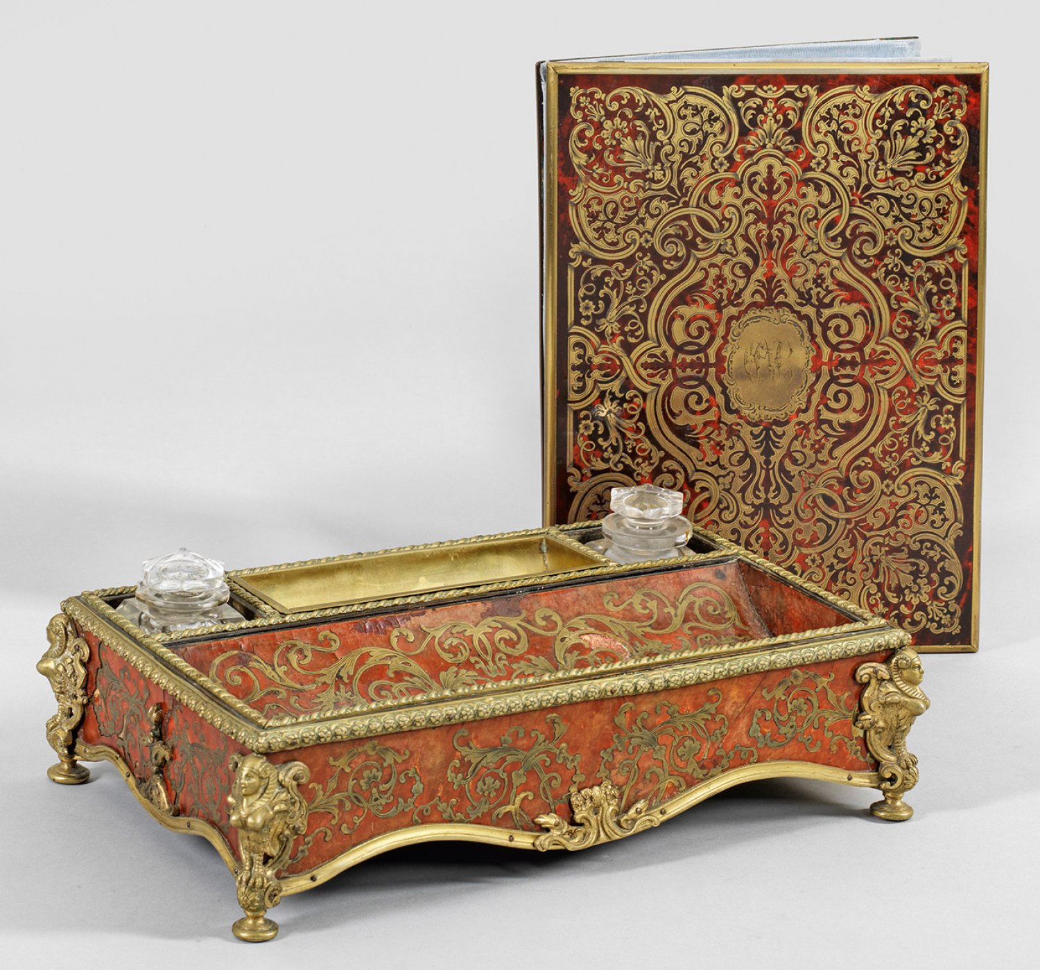 Boulle-Schreibgarnitur mit Schreibmappe Flächendeckender Fond aus ornamentiertem Messing und rot hinterlegtem Horn in sog. Premiere Partie Boulle-Technik sowie Applikationen aus Bronze. Gerader, passig geschweifter Korpus, flankiert von reliefplastischen Fabeltieren. Profilgerahmte, tief gemuldete Ablageflächen sowie teilw. besch. Tintenfässer aus Kristallglas. Schreibmappe mit Monogrammkartusche. Teilw. besch.; Schreibzeug-H. 10 cm. 37 cm x 24 cm.