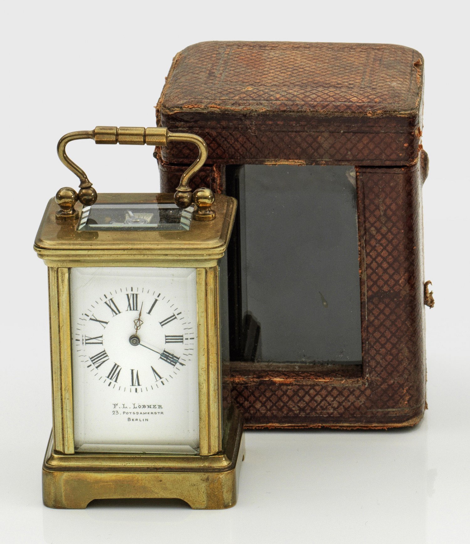 Kleine Reiseuhr mit Etui Messing. Allseitig facettverglaster Korpus auf Profilsockel. Scharnierter Griff. Weißes Emailzifferblatt mit römischen Zahlen, bez. "F. L. Löbner Berlin". Werk mit Echappement. Ges.-H. 9 cm. Lederbespanntes Etui mit violetter Samtauskleidung.