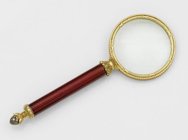 Lupe im Stil von Karl Fabergé. Silber vergoldet und teilw. emailliert. Ornamentierte Rahmung. Zylindrischer blutrot emaillierter Griff über fein guillochiertem Grund. Kannelierte Montierung. Knospenförmiger Abschluss besetzt mit Diamantrosetten. Gest. Kokoschnik 88. L. 15 5 cm.