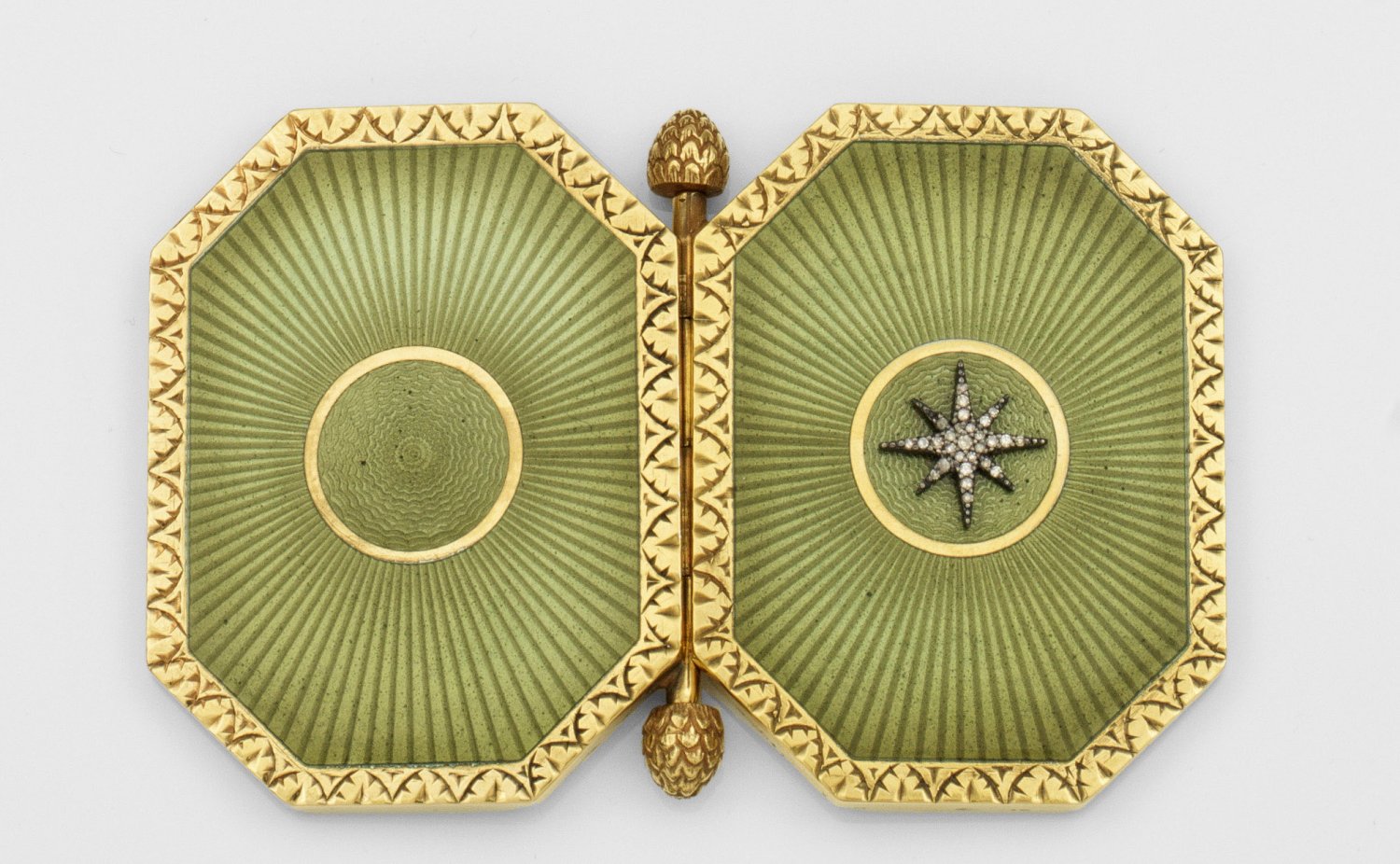Kleiner Taschen-Bilderrahmen in der Art von Karl Fabergé. Silber vergoldet und teilw. emailliert. Achtfach gekantete flache Form. Deckel und Unterseite mit seitlichem Scharnier bekrönt von zwei plastisch gestalteten Pinienzapfen verbunden. Schauseitig zentral applizierter Stern mit Diamantrosen verziert über hellolivgrün emailliertem und wellenförmig bzw. strahlenförmig guillochiertem Grund. Umlaufend reliefplastisch geschnittener Rand. Innen mit zwei Bildausschnitten. Gest. 88. H. 0 5 cm. 6 cm x 4 5 cm.