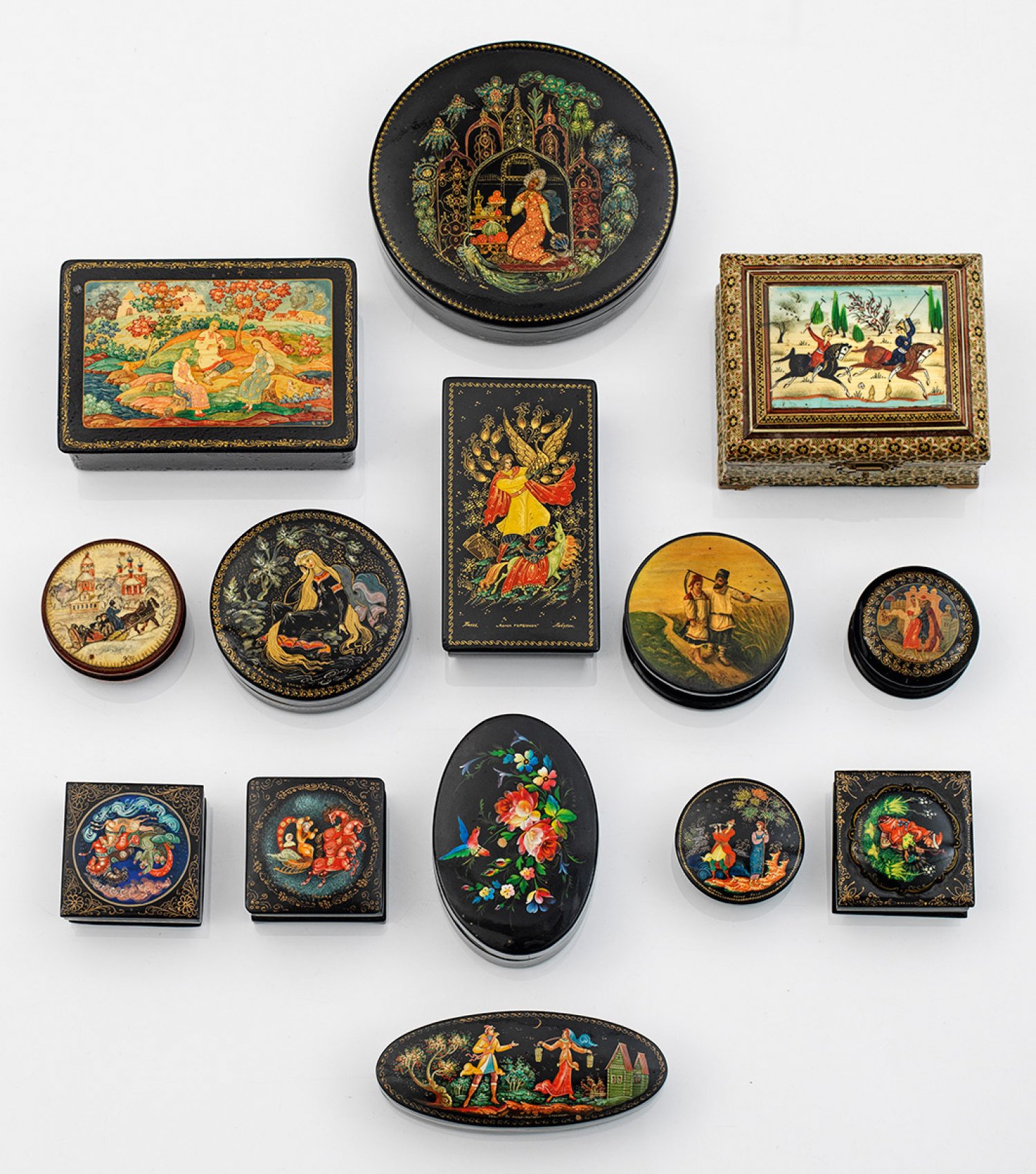Konvolut russischer Lackdosen 14-tlg. Pappmaché, schwarz lackiert, innen zinnoberrot. Rechteckige, runde, elliptische, sowie quadratische Form. Auf flachem Deckel szenische Darstellungen u. a. mit von Pferden gezogenen Schlitten, Märchendarstellungen sowie Blumenbukett. Teilw. Ortsangabe, teilw. sign.; Polychrome Lackmalerei mit Gold; z. T. minim. besch.; 5 cm- 14,5 cm.