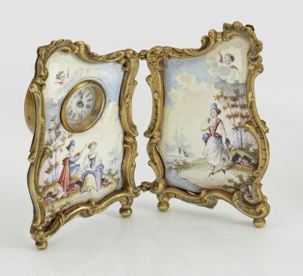 Miniatur-Uhr Messing, teilw. emailliert. Vollplastisch gearbeitete Tischuhr in Form eines Miniatur-Paravents zum Aufstellen. Schauseitig von passig geschweiften, vollplastischen Rocaillen gerahmte Emailmalerei mit Figurenstaffage vor Seenlandschaft sowie eingelassene kleine Uhr mit weißem Zifferblatt und blauen römischen Zahlen. Werk mit Schlüsselaufzug. Minim. best.; H. 6,2 cm. 7 cm.