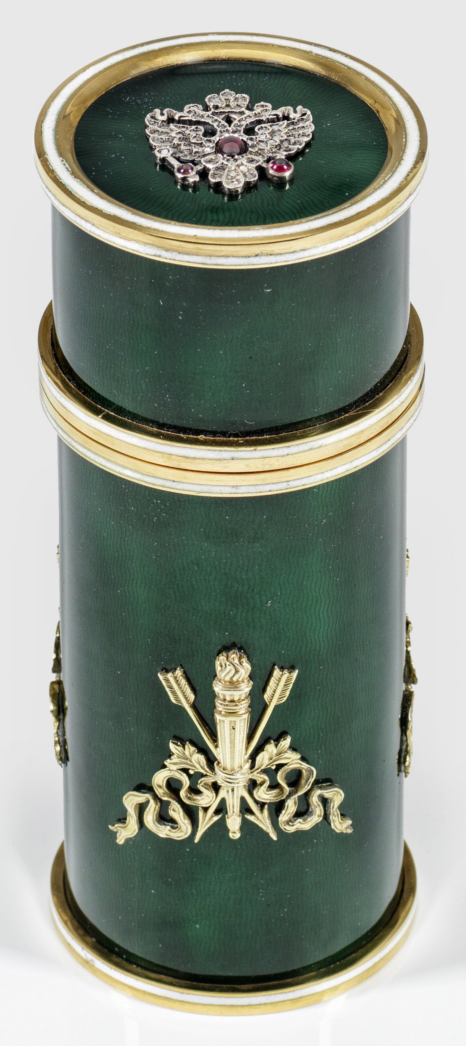 Email-Zierdose Silber vergoldet. Hoch zylindrische Form. Umlaufend fein wellenförmig guillochierte und dunkelgrün emaillierte Wandung teilw. mit weißen Zierlinien. Auf der Wandung Applikationen mit reliefierten Fackeln und Pfeilen von Bändern zusammengehalten. Deckel bekrönt von einem Doppelkopfadler. Akzentuiert durch kleine Diamantrosen und Granatcabochons. Gest. 88. H. 13 5 cm. D. 5 5 cm.