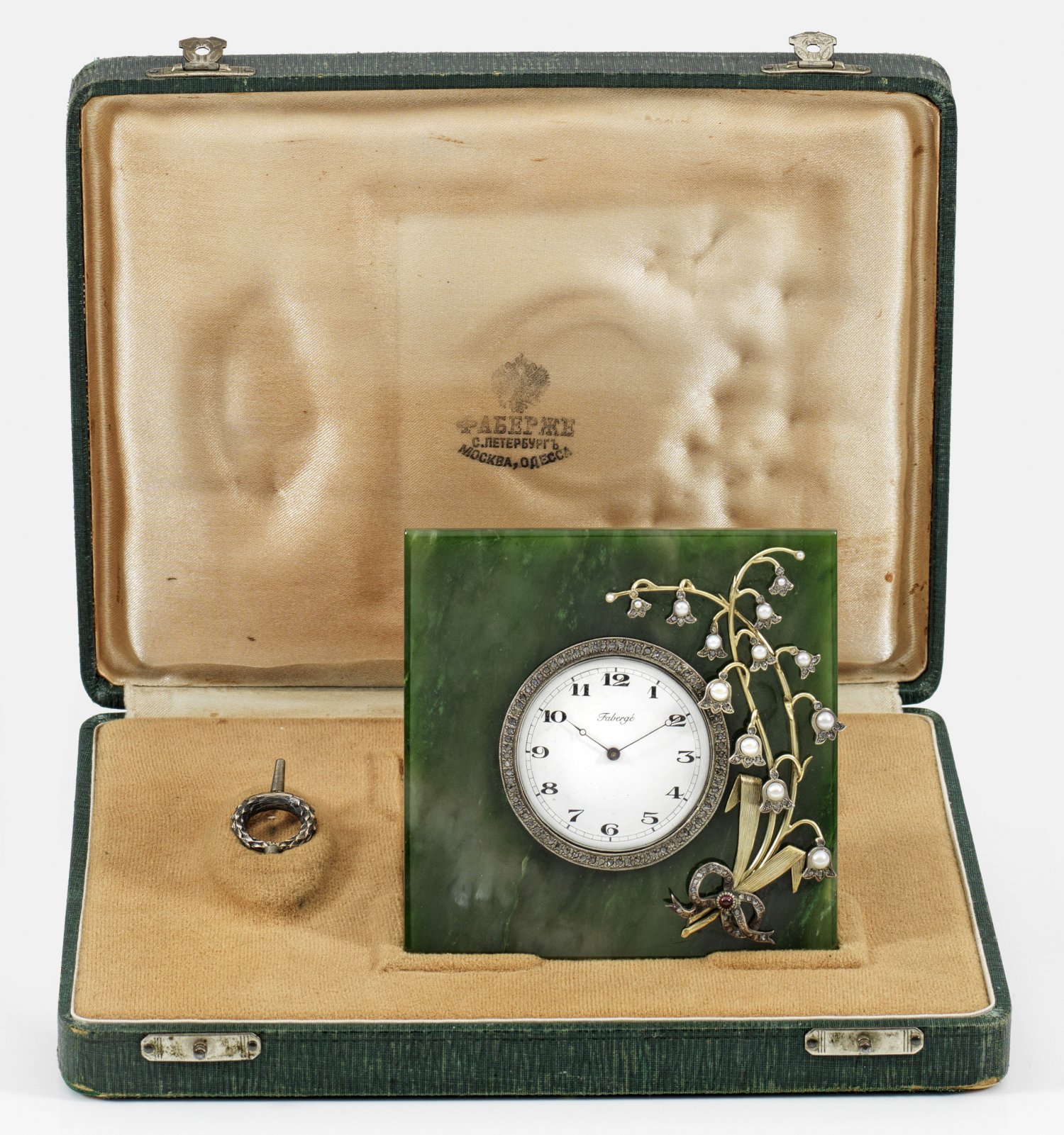 Kleine Tischuhr Gold Silber und Nephrit. Mit originalem grünem Etui. Quadratische dunkelgrüne Nephrit-Platte mit eingelassener Uhr gerahmt von silberner Lünette besetzt mit kleinen Diamantrosen. Weißes Email-Zifferblatt mit schwarzen arabischen Zahlen. Seitlich auf der Platte aufgelegte plastisch gearbeitete zarte Maiglöckchenzweige zusammengebunden mit einer Schleife mit Rubincabochon. Die stilisierten Blüten mit Perlen und Diamantrosen verziert. Rückseitig aufstellbar. Mit originalem Schlüssel. Gest. 88 bzw. 56. 9 2 cm x 9 2 cm.
