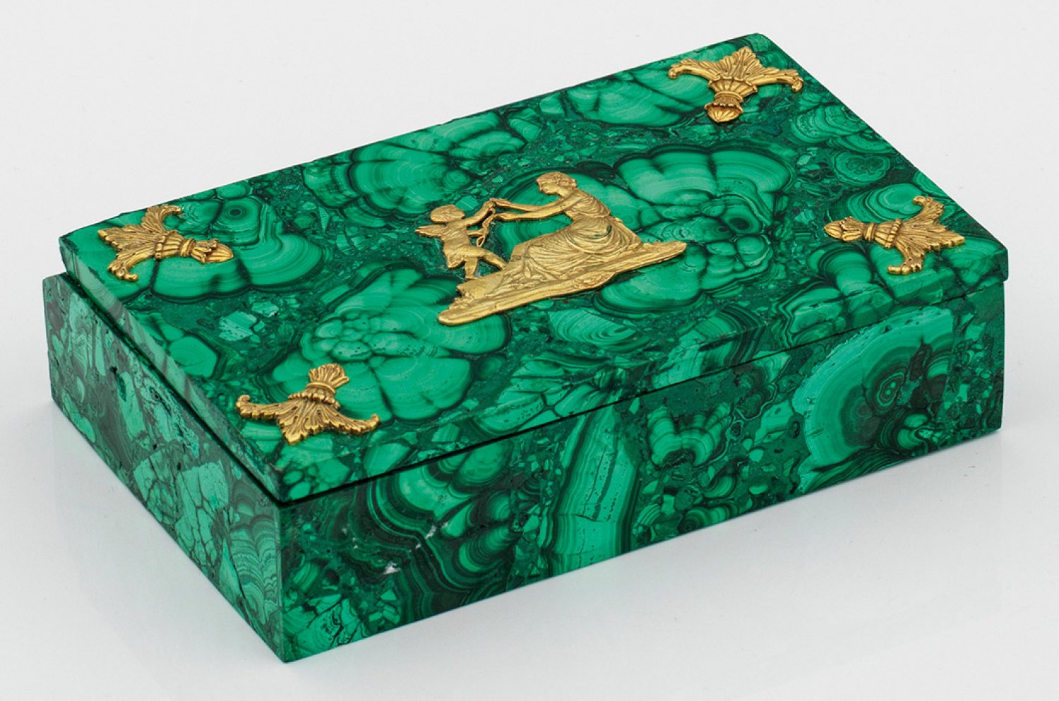 Malachitschatulle im Stil von Karl Fabergé. Malachit. Rechteckige gerade Wandung. Auf flachem Deckel aufgelegtes Relief mit Darstellung der Venus in Begleitung Amors gerahmt von Blattornamenten aus vergoldetem Silber gest. 84. H. 4 cm. 15 cm x 9 cm.