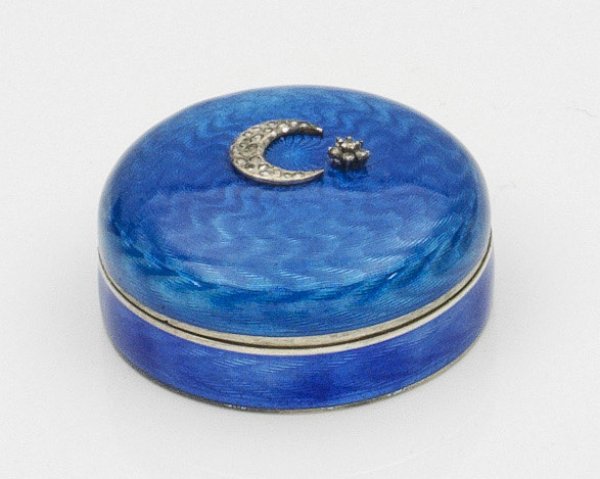 Pillendöschen im Stil von Karl Fabergé. Silber teilw. emailliert. Zylindrischer Korpus mit gerundetem Deckel. Umlaufend hellblau emailliert über wellenförmig guillochiertem Grund. Auf dem Deckel applizierter Halbmond und Stern besetzt mit Diamantrosen. Gest. 88. H. 1 8 cm. D. 4 cm.