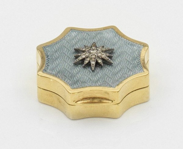 Pillendöschen im Stil von Karl Fabergé. Silber voll vergoldet und teilw. emailliert. Runder Korpus mit achtfach eingezogener Wandung. Auf dem flachen Deckel applizierter Stern ausgefasst mit kleinen Diamantrosen über guillochiertem hellgrau emailliertem Grund. D. 3 6 cm.