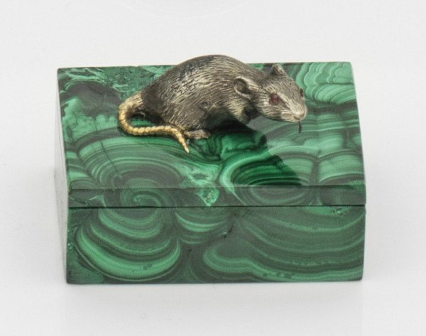 Kleine Malachitdose im Stil von Karl Fabergé. Rechteckige Form mit gerader Wandung. Auf flachem Deckel naturalistisch gearbeitete Ratte aus teilvergoldetem Silber besetzt mit zwei Granatcabochons als Augen. Gest. 84. H. 3 4 cm. D. 5 3 cm.