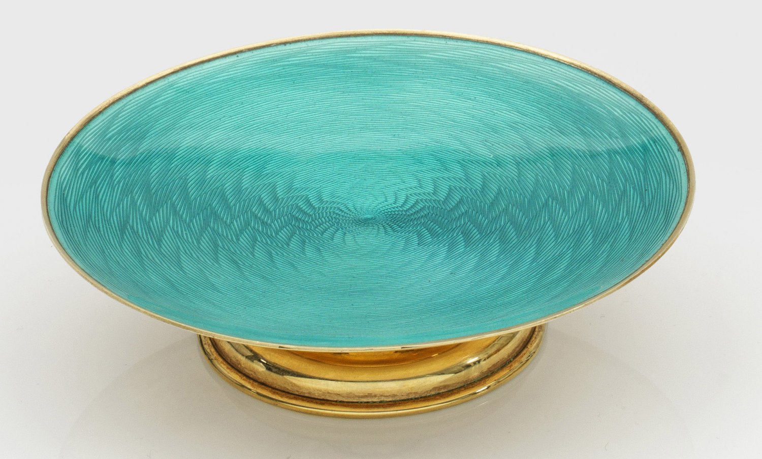 Kleine Email-Fußschale Silber vergoldet. Über gewölbtem Fuß runde weit ausschwingende Schale. Leicht vertiefter Spiegel türkis emailliert über fein guillochiertem strahlenförmigem Fond. Gest. 88. H. 2 6 cm. D. 11 cm.