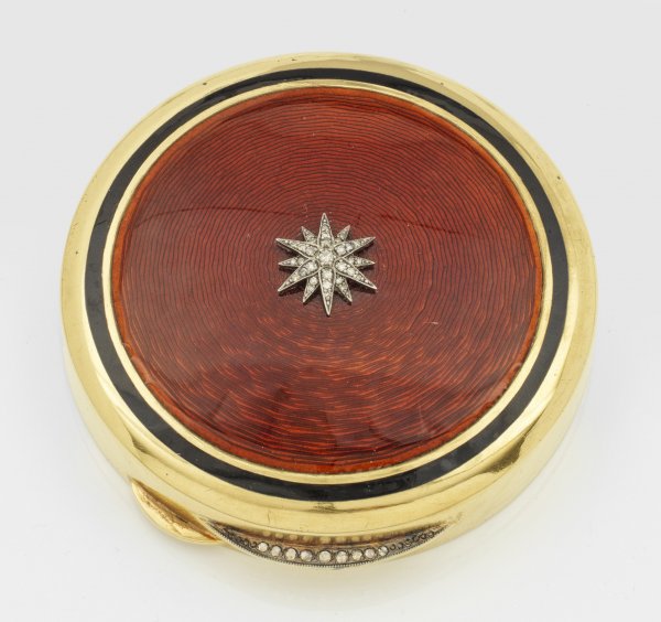 Große Pillendose im Stil von Karl Fabergé. Silber vergoldet und teilw. emailliert. Runder gering aufgewölbter Korpus. Auf dem Deckel Sternapplikation ausgefasst mit kleinen Diamantrosen über rotbraun emailliertem und guillochiertem Grund. Drücker linear mit Diamantrosen besetzt. Gest. 88. D. 6 8 cm.