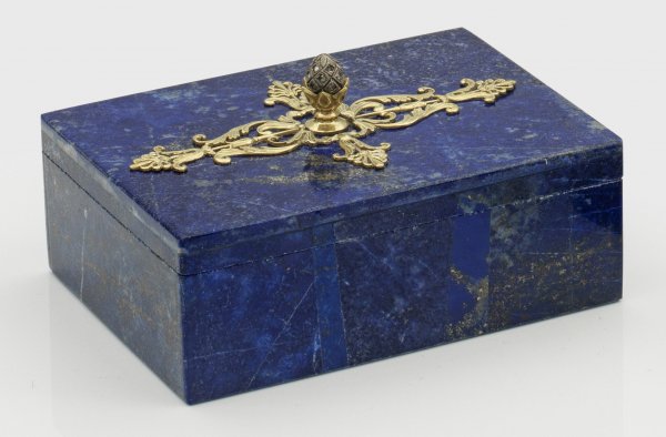 Kleine Schmuckschatulle im Stil von Karl Fabergé. Kastenform aus Lapislazuli und Marmor mit vergoldeter Silbermontierung. Auf flachem Deckel aufgelegtes durchbrochen gearbeitetes feines Volutenornament. Mittig ein vollplastischer Pinienknauf besetzt mit Diamantrosen. Gest. 88. H. 5 cm. 9 7 cm x 6 8 cm.
