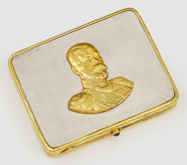 Zigarettenetui Silber teilw. vergoldet und Achat. Flache rechteckige Form auf dem Deckel fein guillochiert sowie besetzt mit einem reliefplastischen Porträt von Zar Nikolaus II. von Russland. Bodenunterseite aus weiß gemasertem olivgrünem Bandachat. Gest. 84. 9 cm x 7 cm.