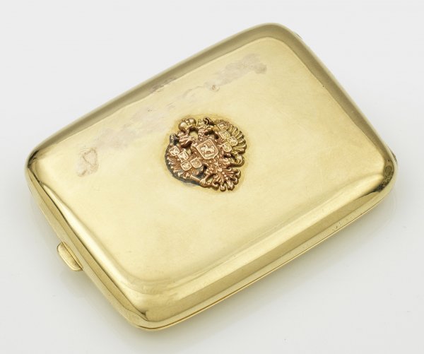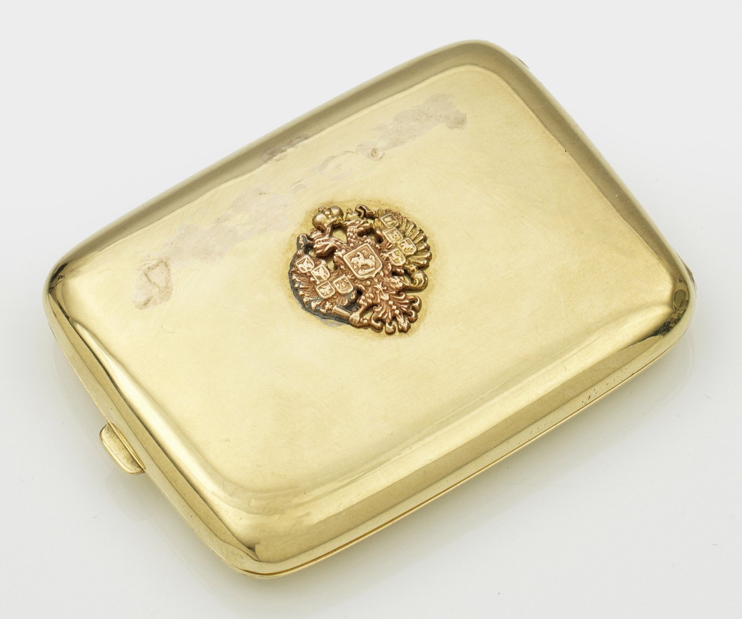 Kleines Pillenetui Gold. Schlicht elegante, rechteckige Form mit gerundeten Kanten und flachem Deckel. Seitlicher Drücker. Auf der Schauseite zentral applizierter, reliefplastischer, russischer Doppelkopfadler. Minim. Gebrauchsspuren. Gest. 14 ct.; Herstellerzeichen. Gew. ca. 33 g. 6 cm x 4,5 cm.